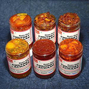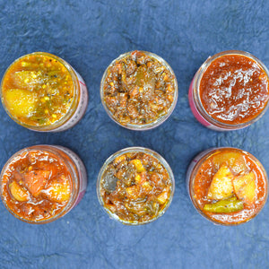 6 amazing tastes of lemon pickles & chutneys. Items in combo - Nimbu Chutney with Garlic, Gu Khajur Achaar with Lemon, Hari Mirch Nimbu Achaar, Lemon Gur Pickle, Lemon Chutney with Whole Garlic, Special Indori Mix Pickle