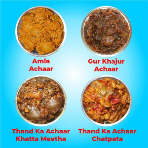 Items in Combo - Amla Achaar, Thand Ka Achaar Chatpata, Thand Ka Achaar Khatta Meetha & Gur Khajur Achaar - 250 grams each.