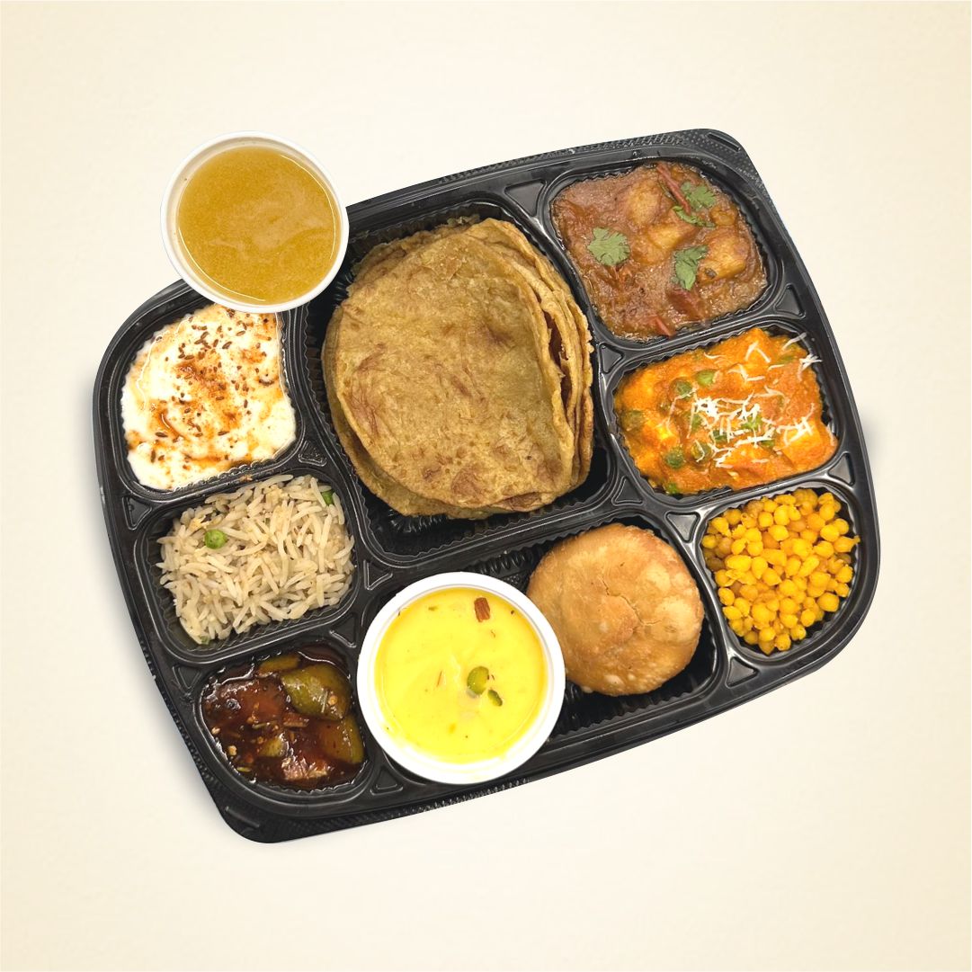 Items in Thali: Aloo Sabzi + 7 Soft Poori + Paneer Sabzi + Jeera Rice + Dahi Vada [1 Piece, Mini] + Kachori [1 Piece] + Moong Dal Halwa [100 g] + Meethi Boondi + Chaas