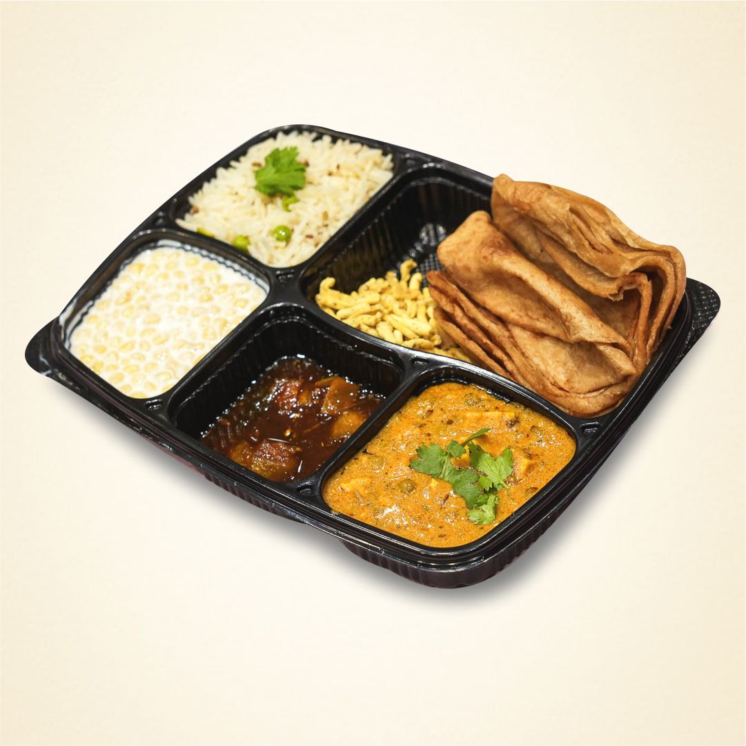 Items in Thali: Paneer Sabzi + 3 Ghee Paratha + Jeera Rice + Boondi Raita + Halwa [100 g] + Sev